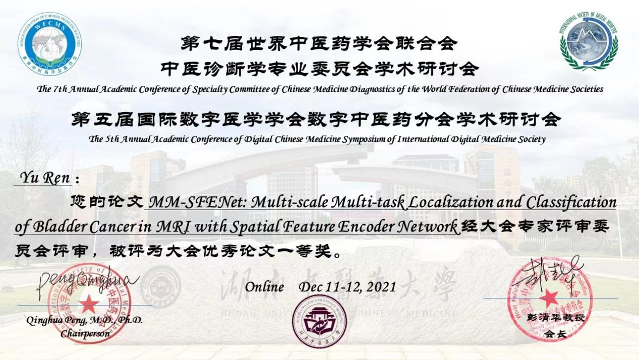 12月11日至12日,第五届国际数字医学学会数字中医药分会学术研讨会在湖南长沙线上线下同步举行。永利刘全金教授与山东中医药大学青岛中医药科学院魏本征教授联合培养的研究生任钰同学提交的论文“MM-SFENet Multi-scale Multi-task Localization and Classification of Bladder Cancer in MRI with Spatial Feature Encoder Network”荣获一等奖。